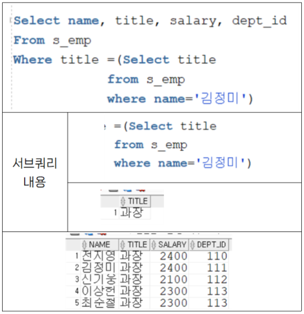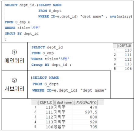 - 서브쿼리→ main쿼리로 전달되는 행이 1개.