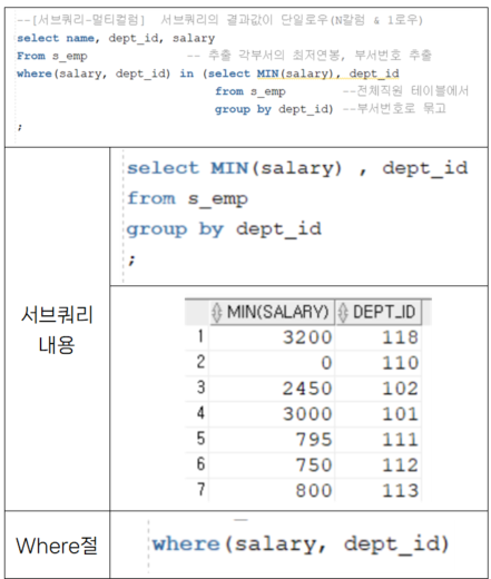 - 서브쿼리 구문을 작성할 때 Where절에서 여러개의 칼럼을 괄호로 묶어서 동시에 비교함.