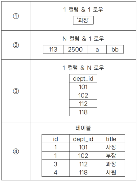 - 서브쿼리의 결과로 나올 수 있는 것