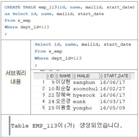 - 기존의 테이블을 이용해서 특정 컬럼 또는 행만으로 원하는 테이블 생성 가능함