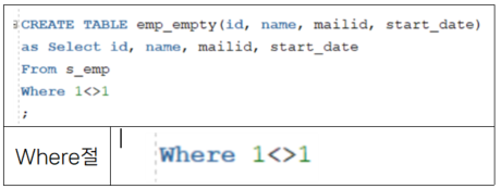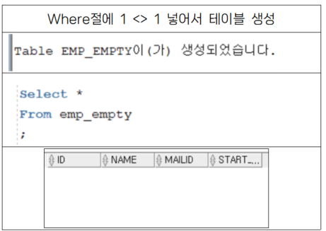 - + Where절에 false인 조건을 넣으면 데이터는 없고 형식만 갖춘 테이블이 생성됨