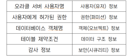 - ๋ฐ์ดํฐ๋ฒ ์ด์ค ๊ฐ์ฒด๋ค์ ์ ์, ์์ฑ, ๊ถํ, ํต๊ณ ๋ฑ์ ๊ดํ ์ ๋ณด๋ฅผ ์กฐํํ ์ ์์.