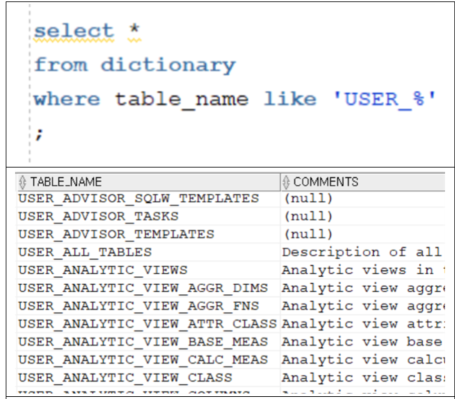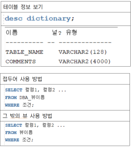 - ๋ฐ์ดํฐ ์ฌ์ ๋ทฐ๋ ์ค๋ผํด ๋ฐ์ดํฐ๋ฒ ์ด์ค ๋ด์ ๊ฐ์ฒด๋ค(ํ ์ด๋ธ, ์ธ๋ฑ์ค, ์ํ์ค ๋ฑ)์ ๋ํ ๋ฉํ ๋ฐ์ดํฐ ์ ๋ณด๋ฅผ ์ ๊ณต.