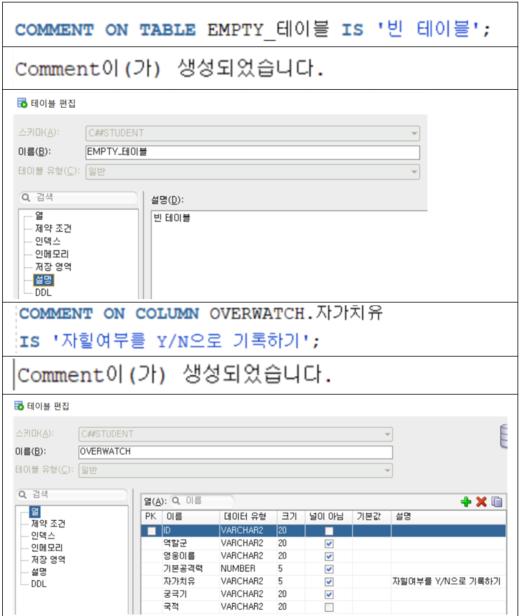 | COMMENT | ํ ์ด๋ธ์ด๋ ์ปฌ๋ผ์ ์ฃผ์๋ฌธ ๋ฌ๊ธฐ |