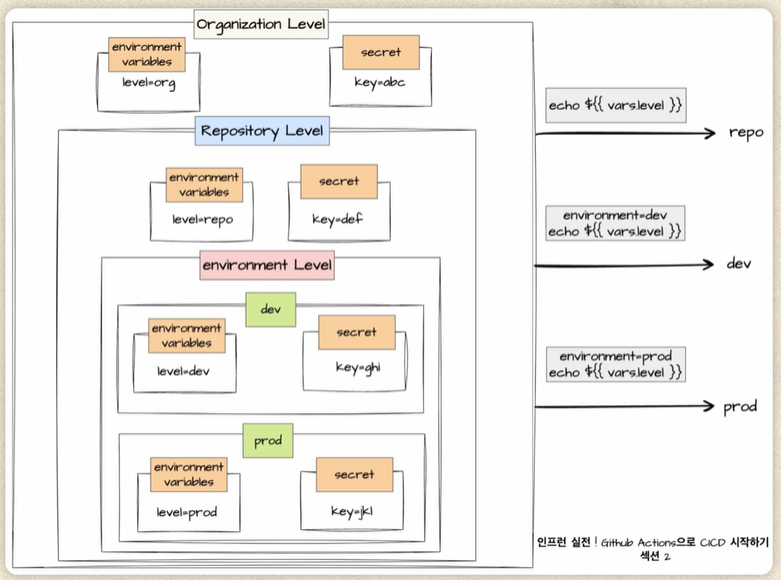 - ์ ์ ๋ ๋ฒจ : organization level, repository level, environment level