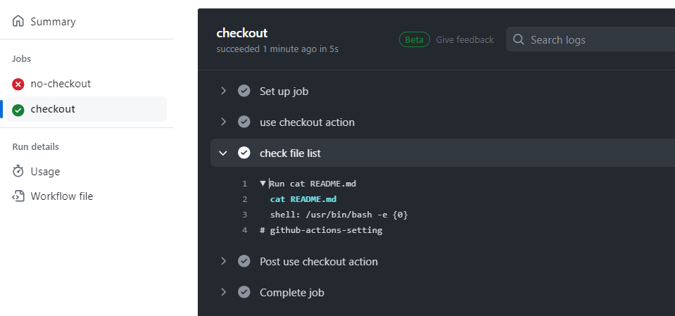 - ์ฒซ๋ฒ์งธ job์ด ์คํจํ ์ด์ ๋ checkout ๋ฏธ์ฌ์ฉ์ผ๋ก ๊นํ๋ธ ๋ ํ์งํ ๋ฆฌ๋ฅผ ๊ฐ์ ธ์ค์ง ์์๊ธฐ ๋๋ฌธ์