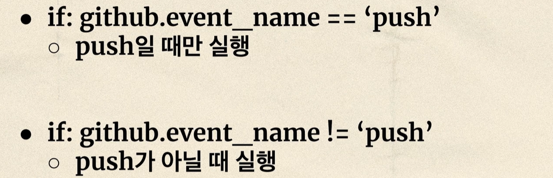 - if condition : workflow๊ฐ ํธ๋ฆฌ๊ฑฐ ๋ ์ดํ job๊ณผ step๋ง ์ธ๋ฐํ๊ฒ ์ ์ด (ex-dev ๋ธ๋์น์ผ๋๋ ์ฒซ๋ฒ์งธ job๋ง ์คํ/ master ๋ธ๋์น์ผ ๋ ๋๋ฒ์งธ job์ ์ธ๋ฒ์งธ step skipํ๊ธฐ)