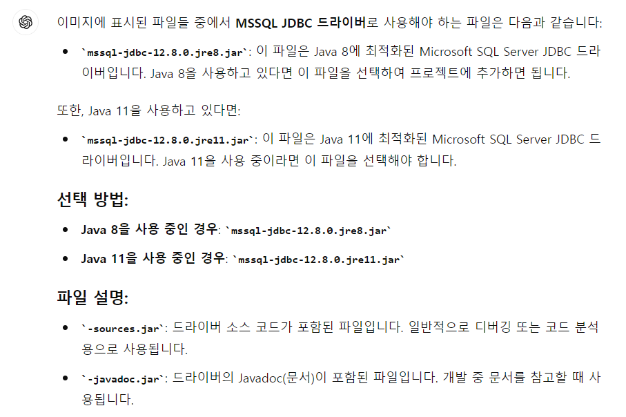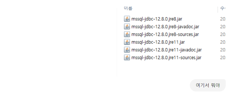 - Microsoft SQL Server JDBC Driver ๋ค์ด๋ก๋ (https://learn.microsoft.com/en-us/sql/connect/jdbc/download-microsoft-jdbc-driver-for-sql-server?view=sql-server-ver15)