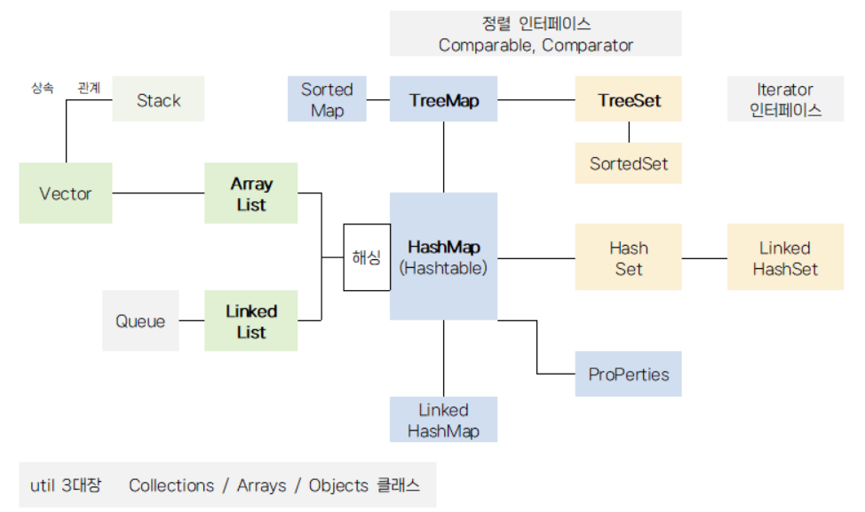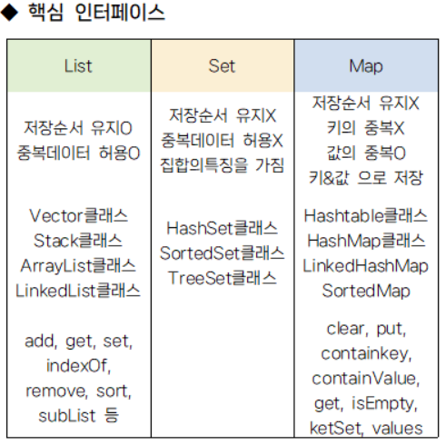 - ์ปฌ๋ ์ ํ๋ ์์ํฌ์ ๋ชจ๋ ํด๋์ค๋ค์ List, Set, Map์ค์ ํ๋๋ฅผ ๋ฐ๋์ ๊ตฌํํจ.