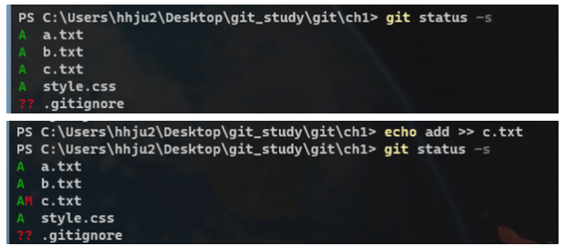 - git status short ์ต์ : ํ์ฌ staging area ์ํ ๊ฐ๋จํ๊ฒ ๋ณผ ์ ์์