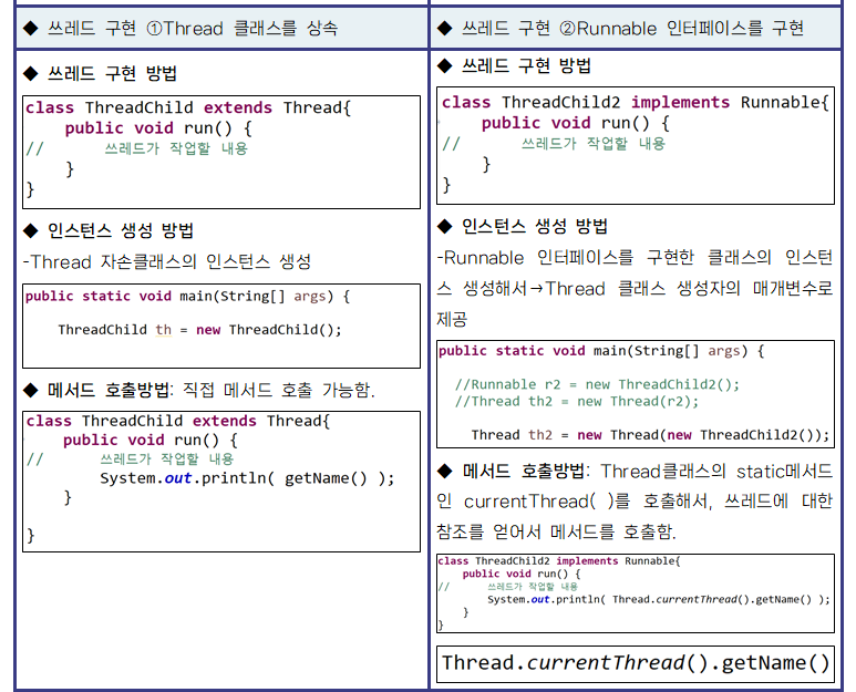 - Thread ν΄λμ€λ₯Ό μμνκ±°λ, Runnable μΈν°νμ΄μ€λ₯Ό ꡬνν΄μ run( )λ©μλμ λͺΈν΅{ }μ μ±μ°λ κ².