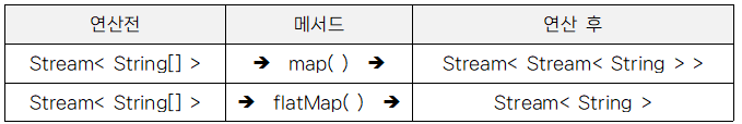 - ์คํธ๋ฆผ์ ํ์ ์ด Stream< T[] >์ธ ๊ฒฝ์ฐ Stream< T >๋ก ๋ค๋ฃจ๋ ๊ฒ์ด ๋ ํธ๋ฆฌํ ๋๊ฐ ์์ด์ map( )๋์ flatMap( )์ ์ฌ์ฉํ ์ ์์.
